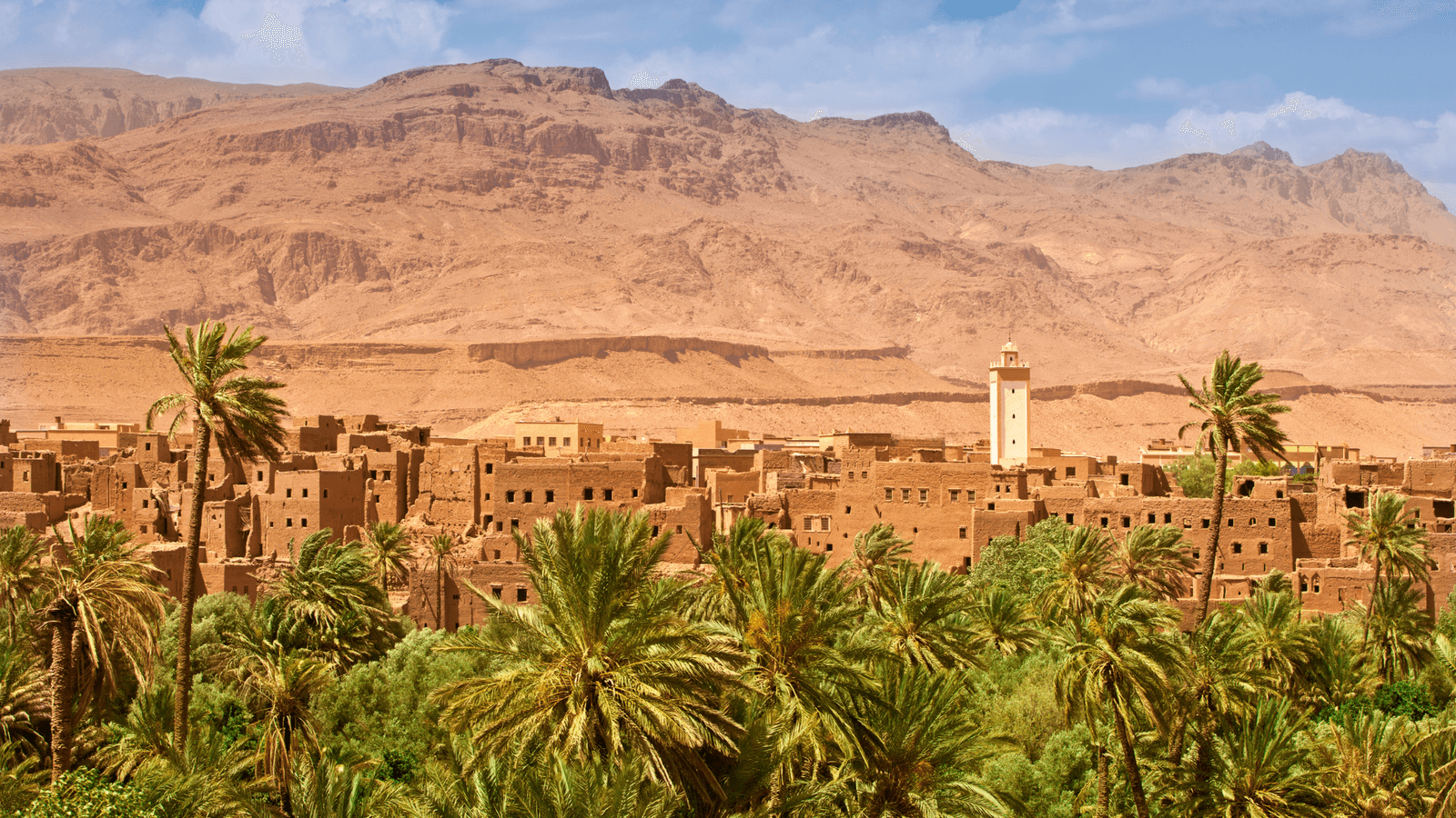 After breakfast, we drive to Ouarzazate,” the gate of the Sahara,” across the Atlas Mountains, a varied landscape, and little Berber villages. We stop at the Tizi’n Tichka-pas (a possibility to take pictures), at a height of 2260 m. We travel to Kasbah Aït Ben Haddou, the most beautiful Kasbah of Morocco, a UNESCO World Heritage site. We continue to the Dades Gorge, Rose Valley, and the palm trees (route of the 1000 kasbahs).